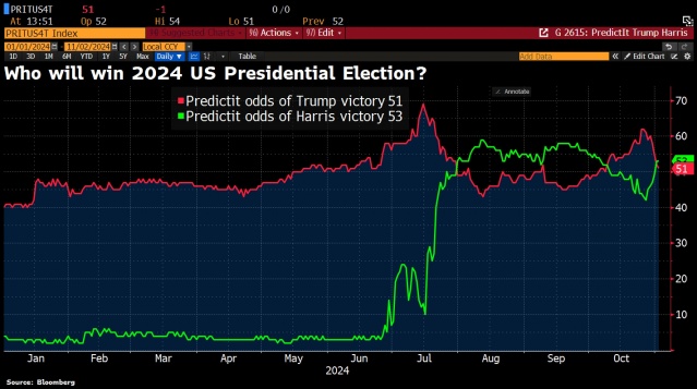 Man muss natürlich bei dieser Grafik wissen, dass Bloomberg Harris unterstützt..:) Die Wettbörsen sehen hingegen weiterhin Trump deutlich vorne.