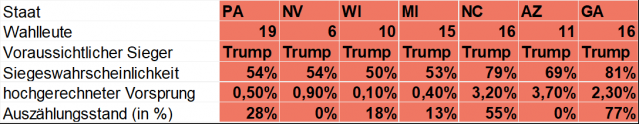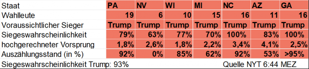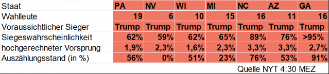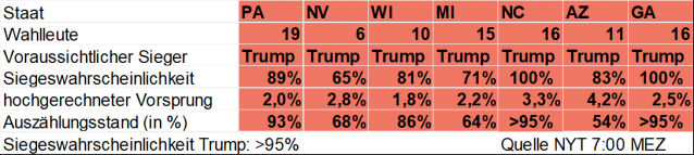 "Die New York Times sieht in ihrer Hochrechnung Trump in allen Swing States vorne und sieht seine Gewinnwahrscheinlichkeit bei 69%."