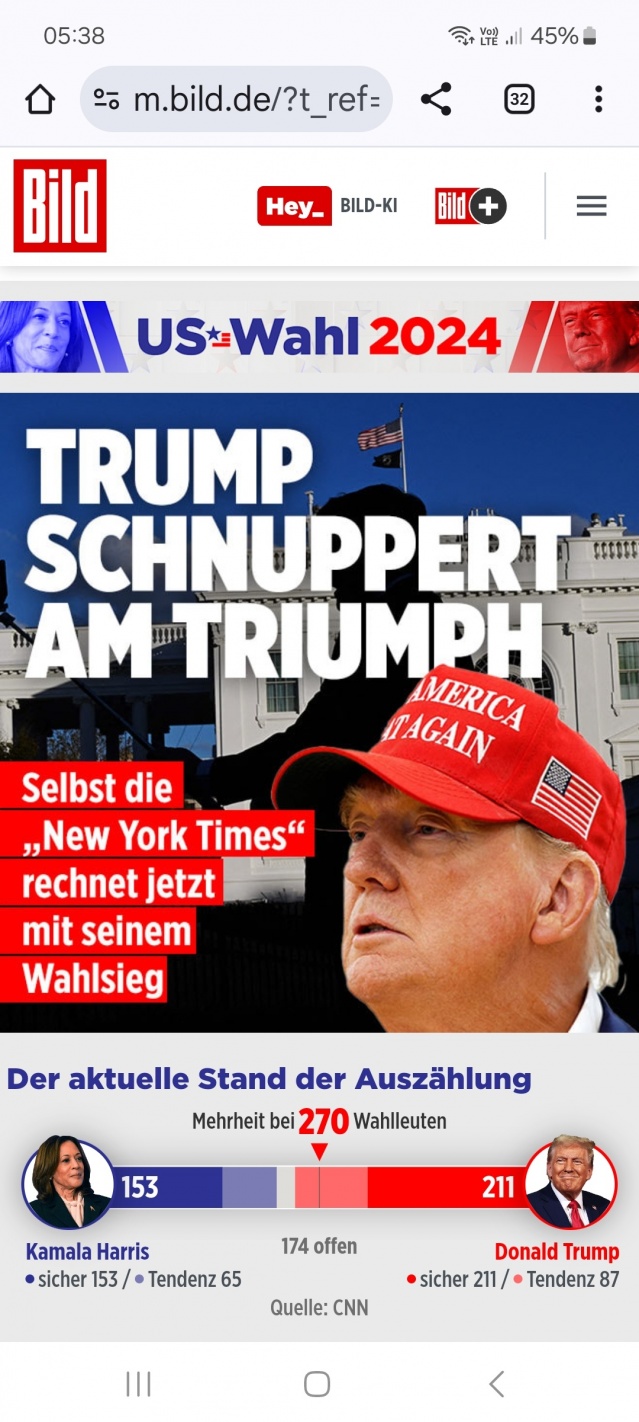 Nach NYT ist die Wahl Trumps nun very likely (>95%). NUR  das ZDF behauptet um 7:15 Uhr noch immer die Wahl ist offen und hofft weiter...erbärmlich!