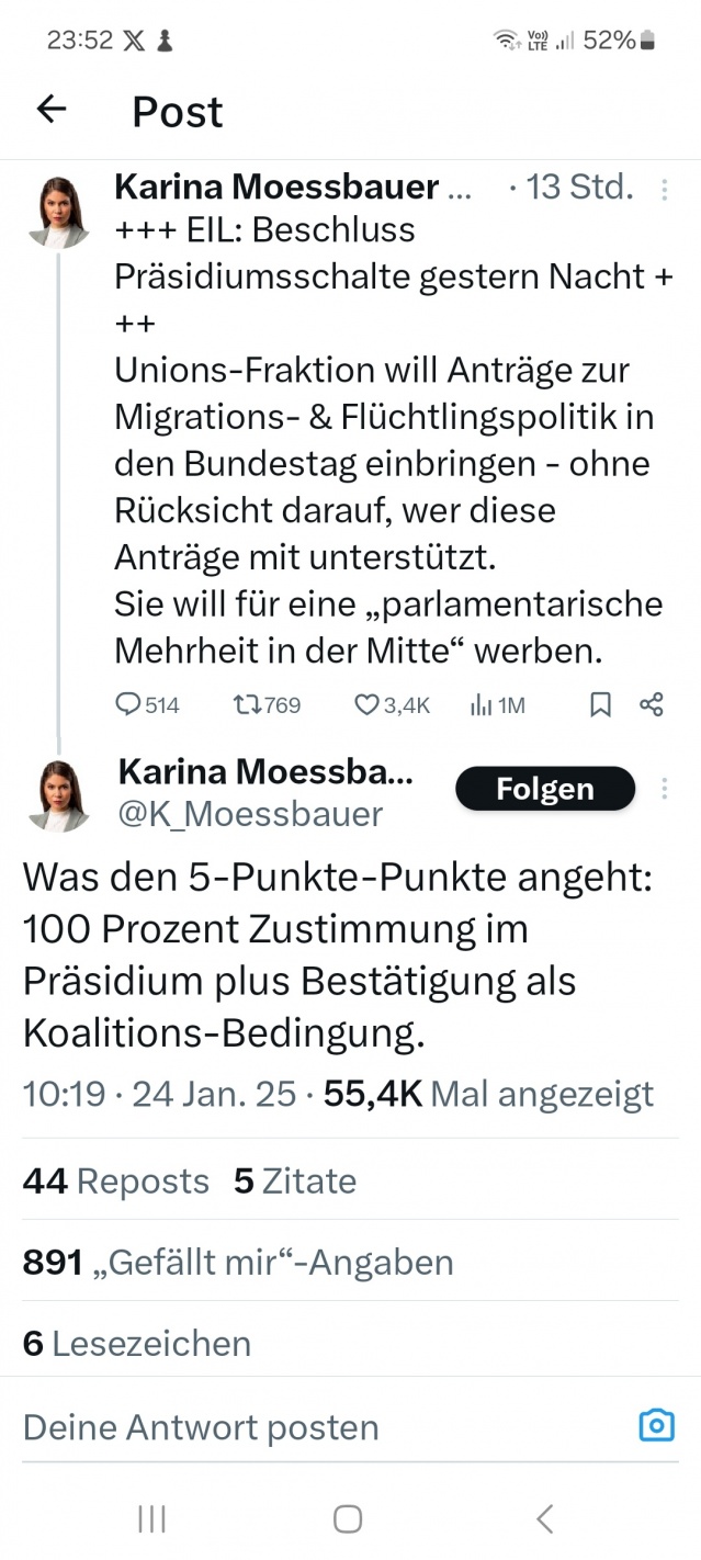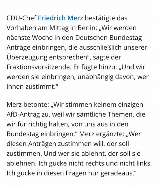 Ich bezog mich in meinen Aussagen darauf, FALLS Fritze "All-in" geht und tatsächlich seine Anträge nächste Woche im Bundestag beschlossen werden. Es sieht aber nicht danach aus, da der Blackrock-Mann sich wieder auf alle Viere begeben hat und als Bittsteller zu SPD und Grünen gekrochen ist und denen die Anträge vorgelegt hat. Da wird also vermutlich nächste Woche wieder beraten, beraten und beraten und dann versandet alles in den Ausschüssen vor der Wahl mit der Aussage nach der Wahl wird man bestimmt alles beschließen.