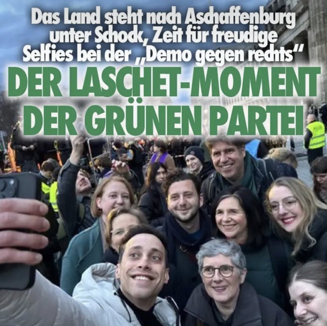 "Lachend bei der „Demo gegen Rechts“ statt politische Vorschläge zu machen, wie solch grausame Verbrechen wie in Aschaffenburg verhindert werden können - der Laschet-Moment von den Grünen"...schreibt auch Nius.